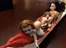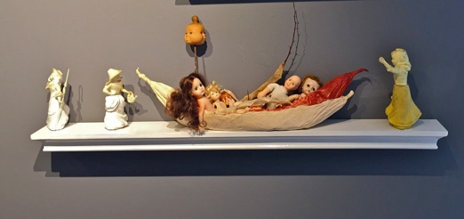 “Unaccompanied” speaks to the harrowing reality that children are being sent out alone by desperate parents to seek the possibility of a safer, better future. The boat in the piece is flimsy, made of paper. Dangers abound inside and outside the vessel. Mistress Mary represents the parents, pouring water to lift their boat and hasten their journey. Bo-peep represents the ravaged countries who have lost their sheep, their future citizens. The girl at the end can read as welcoming and embracing the displaced with open arms or as imposing & intimidating, waving the boat away, reflecting the unpredictability of which it will be.